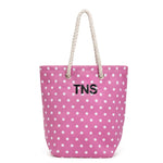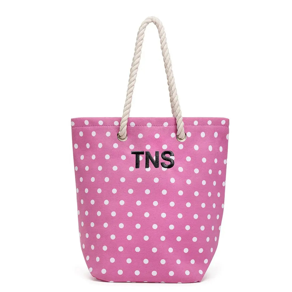 Carry your essentials in style with this charming pink polka dot tote bag—perfect for beach days, grocery runs, or everyday adventures. Crafted from a durable nylon and cotton blend, it features soft rope handles and plenty of space for all your needs. Make it uniquely yours with custom embroidered personalization, whether it's an initial, monogram, or full name. An ideal bridesmaid gift, thank-you present for teachers, or treat-yourself splurge that works as hard as you do. From the bride's big day to your next getaway, this versatile tote does it all without breaking the bank.