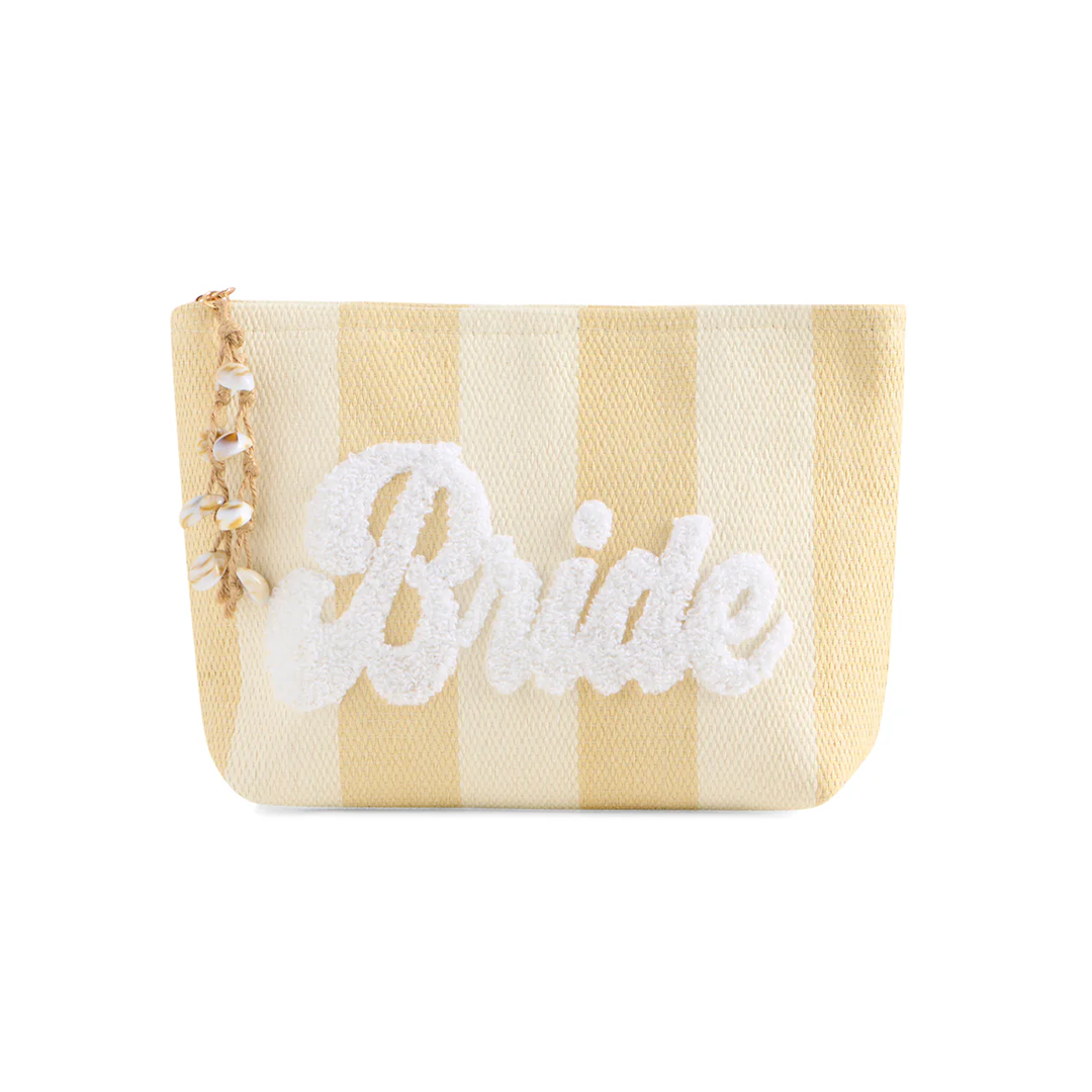 Say “I do” to effortless style with our “Bride” Stripe Zip Pouch. This charming pouch features soft yellow and ivory stripes with plush white chenille lettering for a look that’s sweet, sunny, and oh-so bridal. The top zip closure keeps your essentials secure from bachelorette bash to honeymoon bliss. Finished with a playful shell-accented zipper pull, it’s the perfect accessory for your big-day countdown and beyond.