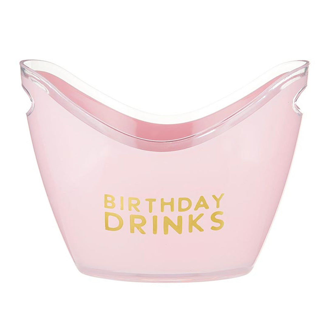 Make your celebration a little more fabulous and a lot more fun with this acrylic beverage bucket, featuring a playful pink base and eye-catching gold foil print that says "Birthday Drinks.".