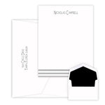 The Anthem Correspondence Card with Raised Ink showcases a sleek design of parallel lines at the bottom, enhanced with foil pressing available in gold or silver. Personalize the top line with your choice from 8 raised ink colors and 10 distinct lettering styles, creating a refined and customized look.