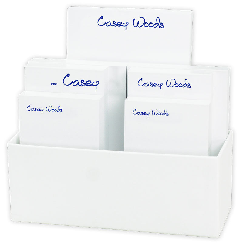 The Anthony 7-Tablet Set - White with Linen holder features our most popular lettering style (Anthony) in your choice of 8 matte ink colors on our exceptional white paper. This item includes four different tablet sizes.