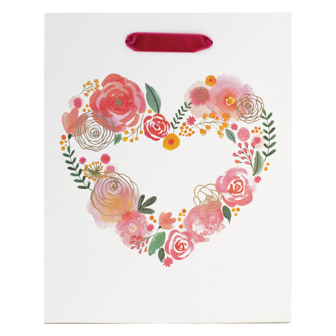 Celebrate love in full bloom with this medium tote bag! Showcasing a floral heart design enhanced with pink foil, sparkling pink glitter, and shiny magenta velvet handles, it’s as delightful as the gift inside. Perfect for making your special someone smile, this playful bag adds an extra touch of charm to any present.