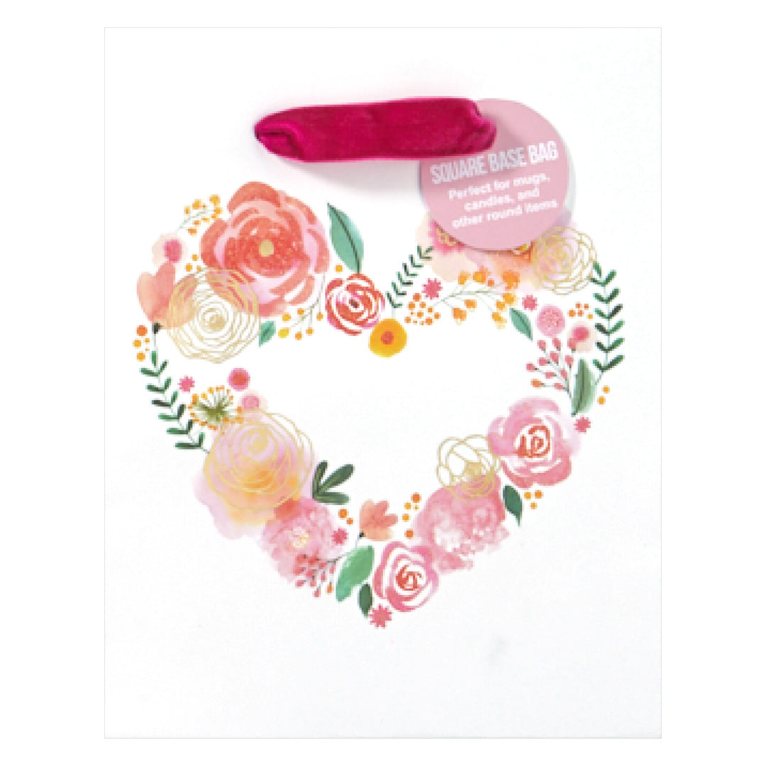 Celebrate love with this charming small tote bag! It showcases a blossoming floral heart highlighted by pink foil, sparkling pink glitter, and shiny magenta velvet handles. This delightful packaging will make your special someone appreciate the gift even more!