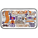 Celebrate your Clemson University pride with this unique Trinket Tray featuring a collage of iconic campus landmarks and symbols. Crafted from ceramic and individually hand-painted, this elegant dish captures the spirit of the Tigers. An ideal gift for devoted fans, alumni, students, or faculty who cherish their alma mater. Dimensions: 8" x 4.5".