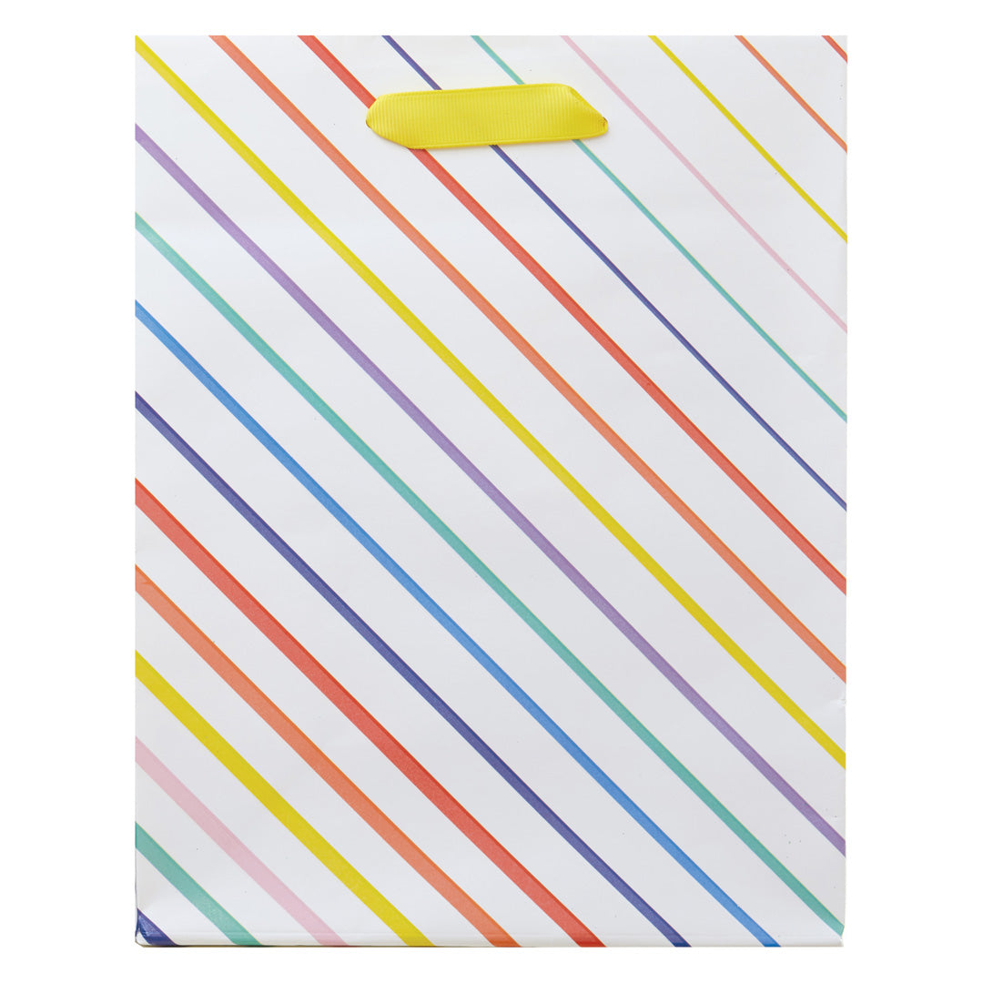 Make your gift extra special with this delightful medium tote bag! It showcases diagonal rainbow stripes accented with shimmering holographic foil for a festive sparkle. The yellow grosgrain ribbon handles are both chic and practical. Ideal for birthdays, anniversaries, or holidays, this bag adds a playful and stylish flair to any celebration.