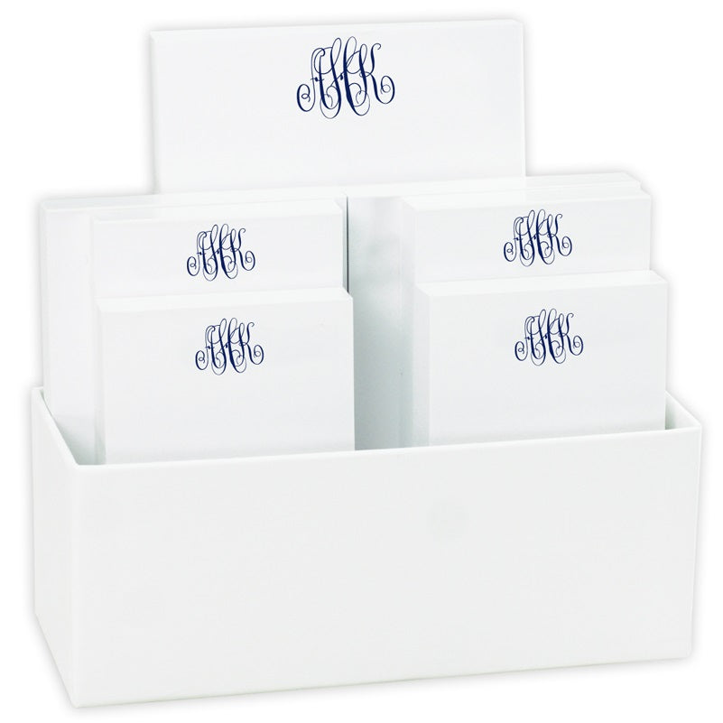 The Delavan Monogram 7-Tablet Set - White with Linen holder features a choice of 10 monograms and 8 matte ink colors on our exceptional white paper. This item includes four different tablet sizes.