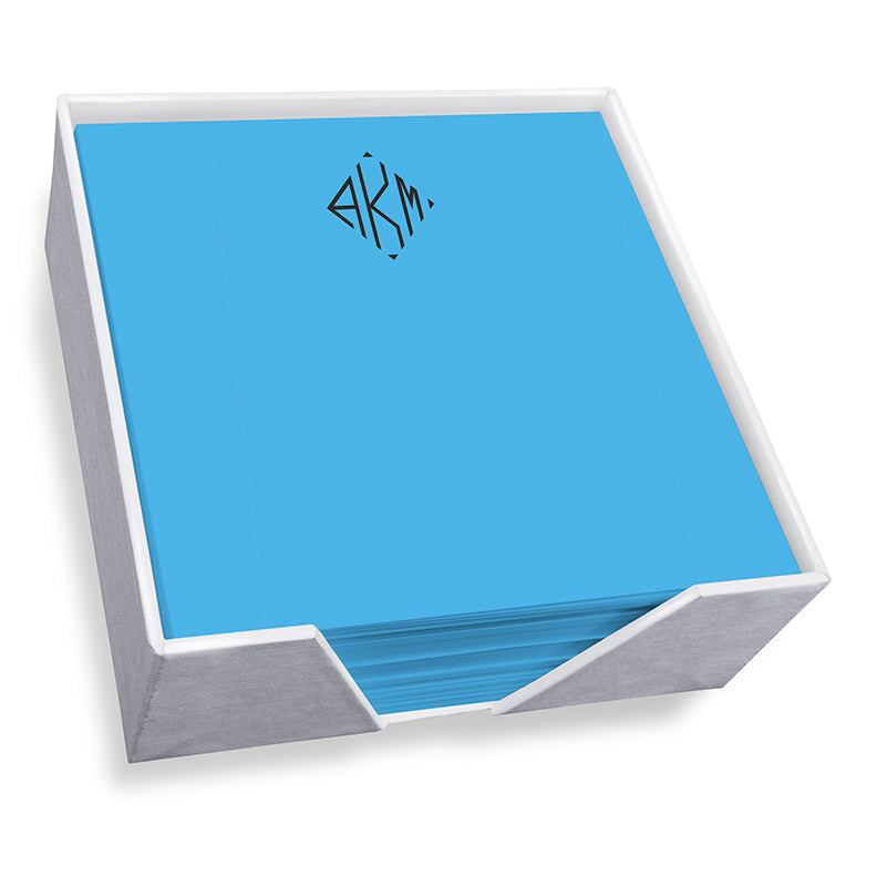 Our Delavan Monogram Memo Square - Carnival with holder allows a choice between 5 colorful papers and 10 popular monograms, printed top center in black, matte ink.