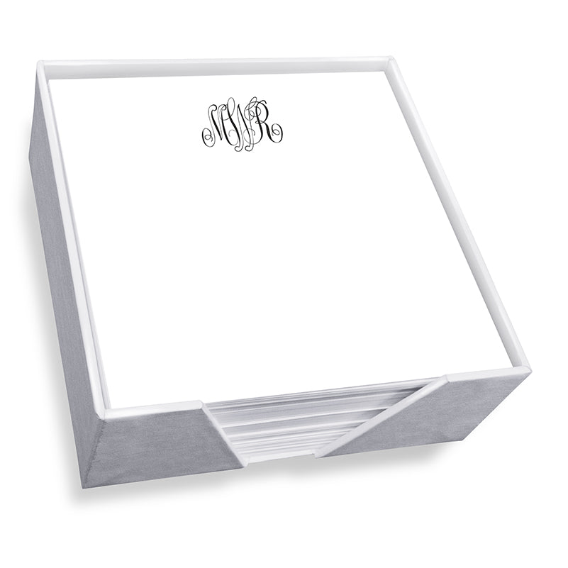 Our Delavan Monogram Memo Square - White with holder features your choice of 10 monograms, printed top center in one of 16 matte ink color selections. Produced on our high-quality white paper text sheets.