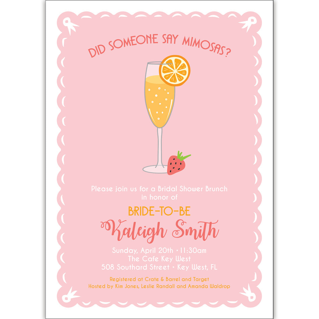 Share your celebration with this artisan Did Someone Say Mimosas invitation, crafted to add a delicate, handcrafted flair to your special event.