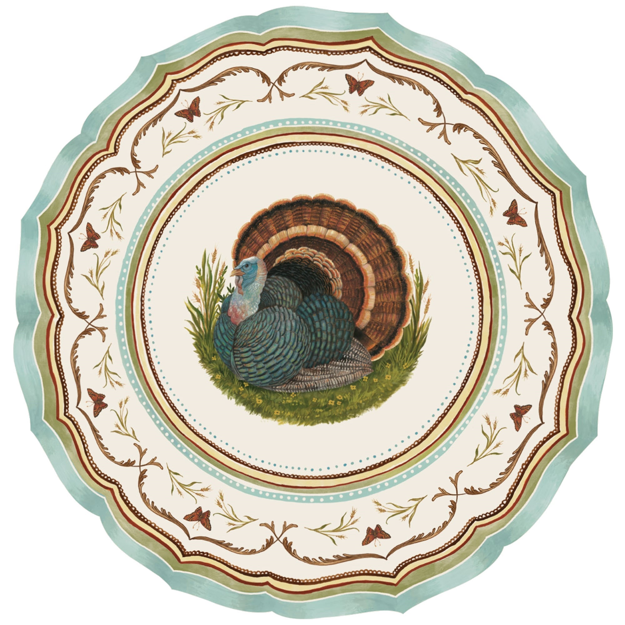 Bring a whimsical charm to your Thanksgiving feast with our Die Cut Heritage Turkey China placemats. Featuring a proud Tom turkey surrounded by delicate fluttering butterflies, these paper placemats create a delightful and festive focal point for your table. Crafted with care in the USA from FSC certified recycled materials, they combine sustainability with style. Perfect for adding an elegant yet playful touch, each set includes 12 loose placemats designed to protect your surface while enhancing your holiday atmosphere. Make your tablescape memorable and inviting with this charming seasonal accent.
