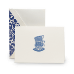A charming pearl white folded note featuring stacked tea cups, elegantly engraved in classic blue toile patterns. Paired with a matching toile-patterned envelope lining for a timeless touch. Perfect for thank-you notes, heartfelt messages, or stylish everyday correspondence.