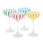 Celebrate your tablescape with our Set of 4 Celebration Hand-Painted Stripe Coupe Glasses. Crafted with care, each glass features unique stripes in Blue, Pink, Green, and Yellow, adding a pop of color to your decor. With a 12 oz capacity, these glasses are perfect for serving your favorite cocktails or mocktails.