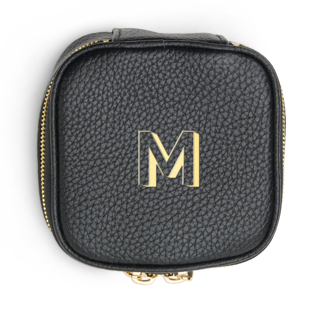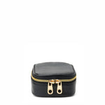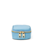 This charming compact case offers exceptional functionality. Crafted from full-grain leather, the Camilla features elegant gold-tone zippers and thoughtfully designed compartments for your jewelry. Its lid includes a detachable earring holder secured with magnetic clasps, while the base contains two microsuede ring straps sewn in place. It also includes one removable microsuede pouch and a meticulously crafted microsuede necklace keeper that safeguards your chains from tangling. Available in smooth and pebbled leather finishes in various colors, the case measures 4.5" long by 4.5" high by 2.5" deep.