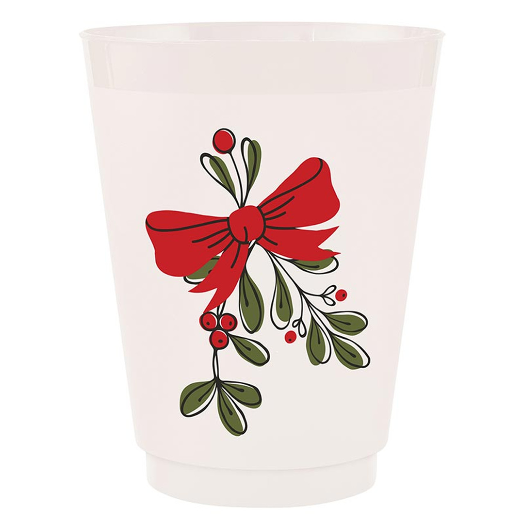 Celebrate the season with these frosted plastic cups featuring a festive mistletoe design accented by a classic red bow. These FF Cups are perfect for serving drinks at all your holiday gatherings. Ideal for both indoor and outdoor use, these cups add a cheerful and stylish touch to your Christmas festivities.