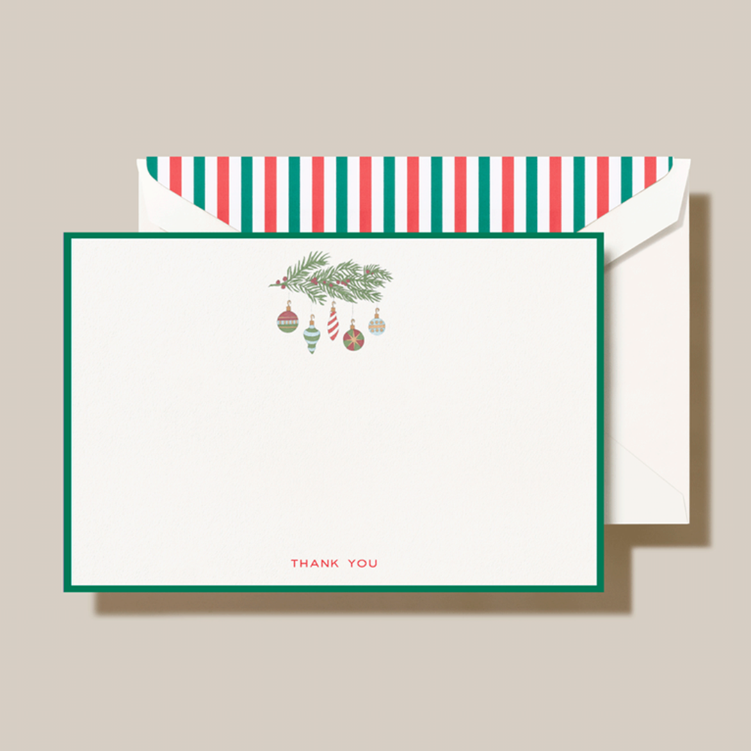 Celebrate the holiday season with our Bordered Ornaments Thank You Card, where vibrant, colorful ornaments dangle playfully from a spruce branch, creating a festive backdrop for your heartfelt message of gratitude. The cheerful red "thank you" at the bottom is nestled within a crisp green frame, perfectly matched by the lively green and red striped envelope lining for a coordinated and joyful presentation. This card turns a simple note of thanks into a memorable keepsake, ensuring your appreciation shines brightly and leaves a lasting impression well beyond the holiday season. Spread warmth, cheer, and gratitude with every word you share!