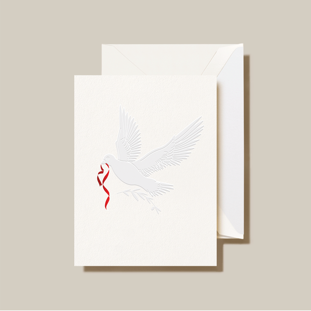 Embrace the festive fun with our Peace on Earth Dove Holiday Greeting Card, a joyful way to share your season’s greetings with a touch of elegance and playfulness. This beautifully crafted card features a graceful embossed dove, its delicate wings inviting a gentle touch to fully appreciate the fine detail. The dove carries a vibrant red ribbon, a cheerful symbol of love and joy that perfectly complements its message of peace and hope. Inside, the card opens to reveal the heartfelt wish, “May this Holiday Season bring you peace and tranquility,” printed in bright red to match the ribbon’s festive hue. The accompanying pearl shimmer-lined envelope adds a dash of sparkle, making every card feel like a special gift. Whether you’re sending cozy cheer to family near or far, or playful holiday wishes to friends and colleagues, this card delivers your warmest sentiments wrapped in timeless charm and a sprinkle of seasonal magic. It’s the perfect choice to spread peace, joy, and a little holiday mischief!