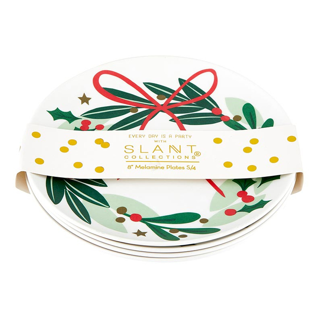 Set a festive table with this Melamine Plate set featuring a charming wreath design. Includes 4 round plates, each 8 inches in diameter, perfect for serving holiday treats with style.
