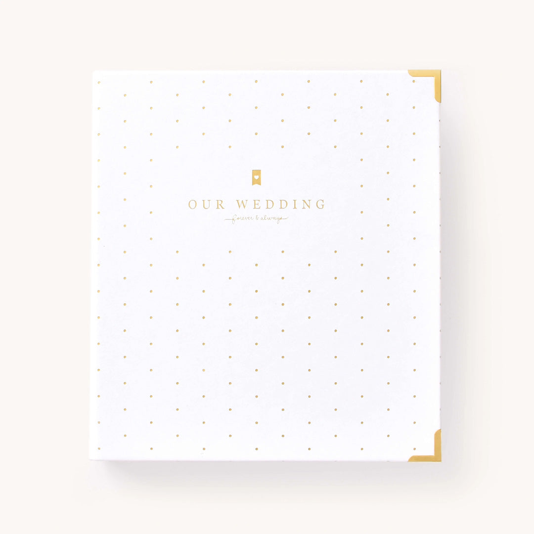 The Simplified Wedding Planner is thoughtfully designed to keep couples organized throughout their wedding journey. Presented in an exquisitely crafted box adorned with elegant gold foil accents, this undated binder-style planner features a white leatherette cover with a delicate dot pattern, gold protective corners, and a matching interior liner and pocket. It includes a sticker sheet, six comprehensive sections filled with planning pages and worksheets, all printed on high-quality pure white paper—making it both a practical and refined companion for your special day.