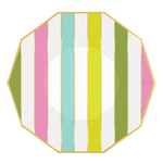 Add a colorful touch to your next gathering with these striped decagon shaped paper plates that feature a gold foil rim!