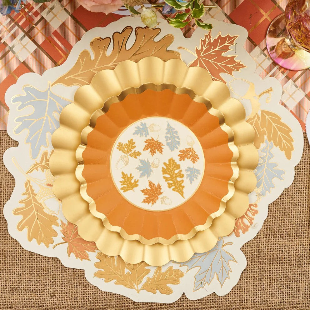 These scalloped-edge salad plates from the Gilded Harvest collection feature a delicate harvest leaf design with shimmering gold foil accents, making them a perfect complement to your autumn table setting. These plates are both durable and disposable, allowing you to skip the dirty dishes, without sacrificing quality and style. Your guests will never believe they’re disposable!