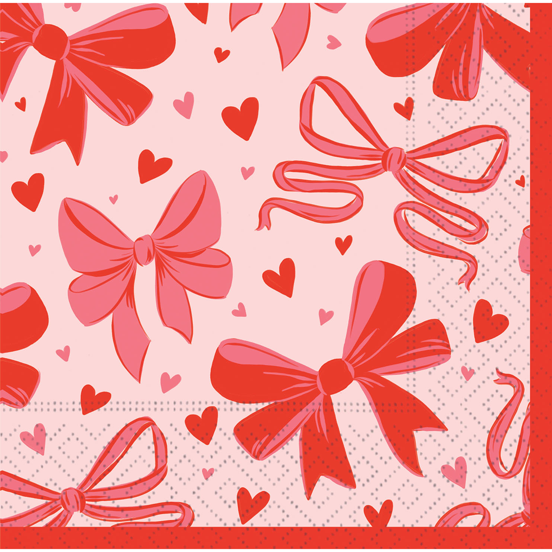 Tie up your Valentine’s celebration with charm using these Lovely Bows Cocktail Napkins! Adorned with an elegant pattern of delicate red and pink bows, sprinkled with sweet hearts, these napkins bring a festive and romantic flair to any gathering. Perfect for serving drinks and treats, they add a touch of sophistication and love to every sip and bite!