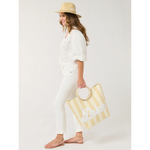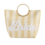 Celebrate in seaside style with the "Bride" Stripe Tote. This spacious bag features subtle tan and cream stripes, soft looped “Bride” lettering, and elegant round handles wrapped in raffia and trimmed with seashell accents. Designed with a magnetic snap closure and one inner slip pocket, it keeps your bridal essentials secure from the bachelorette party to the beach. Lightweight and roomy, it's the perfect plus-one for every pre-wedding getaway.