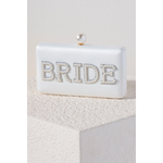 The "Bride" Pearl Minaudière is your sparkling sidekick for the big day and beyond. Wrapped in a sleek satin finish, it features the word “Bride” spelled out in gleaming faux pearls and crystal embellishments for a statement-making touch. The pearl-topped magnetic frame closure adds a luxe detail, while the detachable cross-body chain keeps your styling options open. Perfectly sized for wedding-day essentials, this clutch is as functional as it is fabulous.