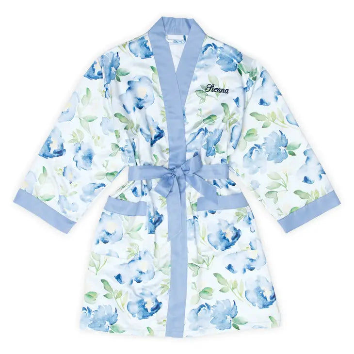 WOMEN'S PERSONALIZED EMBROIDERED FLORAL SATIN ROBE - BLUE