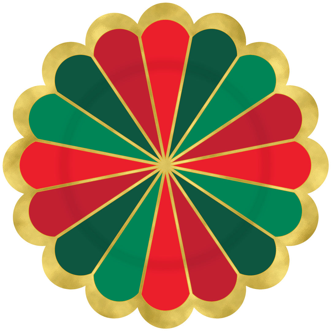 Bring holiday cheer to your table with this festive die-cut dinner plate! Designed in vibrant red and green with elegant gold foil accents, this plate adds a joyful touch to any celebration. The unique scalloped shape and radiant colors make it astandout addition to your holiday decor. Perfect for elevating your seasonal gatherings—set your table with style and spread the holiday spirit!