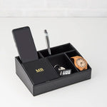 Ideal for office desks or kitchen counters, this table tray offers a refined solution for organizing your accessories. Its elegant faux leather finish and modern design bring a touch of sophistication to any surface. Thoughtfully designed with space-saving compartments, it helps clear clutter and accommodate other essentials. Perfect for bedside tables, it features a docking station to manage charging cords neatly, along with adjustable dividers to fit various phones and small tablets precisely. For a personalized touch, the main compartment can be monogrammed, making it an exceptional, customized gift for both men and women.