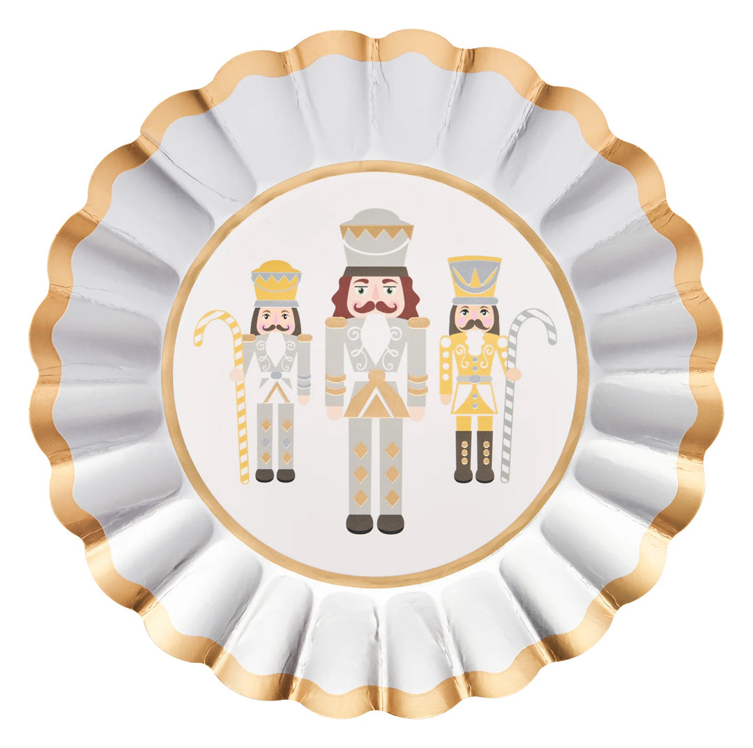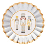Elevate your holiday table into a professional tablescape with our new Gilded Nutcracker collection. Featuring our signature scalloped edge plates adorned with elegant gold foil accents, this collection effortlessly blends modern style with timeless elegance. Showcasing classic nutcracker imagery in a sophisticated silver, gold, and white color palette, these salad plates will add glitz and glam to your holiday meal. With sleek design elements and charming details, your guests won't believe that they're disposable!