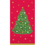 Create a festive and elegant tablescape with these holiday guest towels! They feature an opulent Christmas tree with gold-foil decorations and starbursts. Set them out for a seasonal, easy to clean set up! This towel comes in a set of 12.